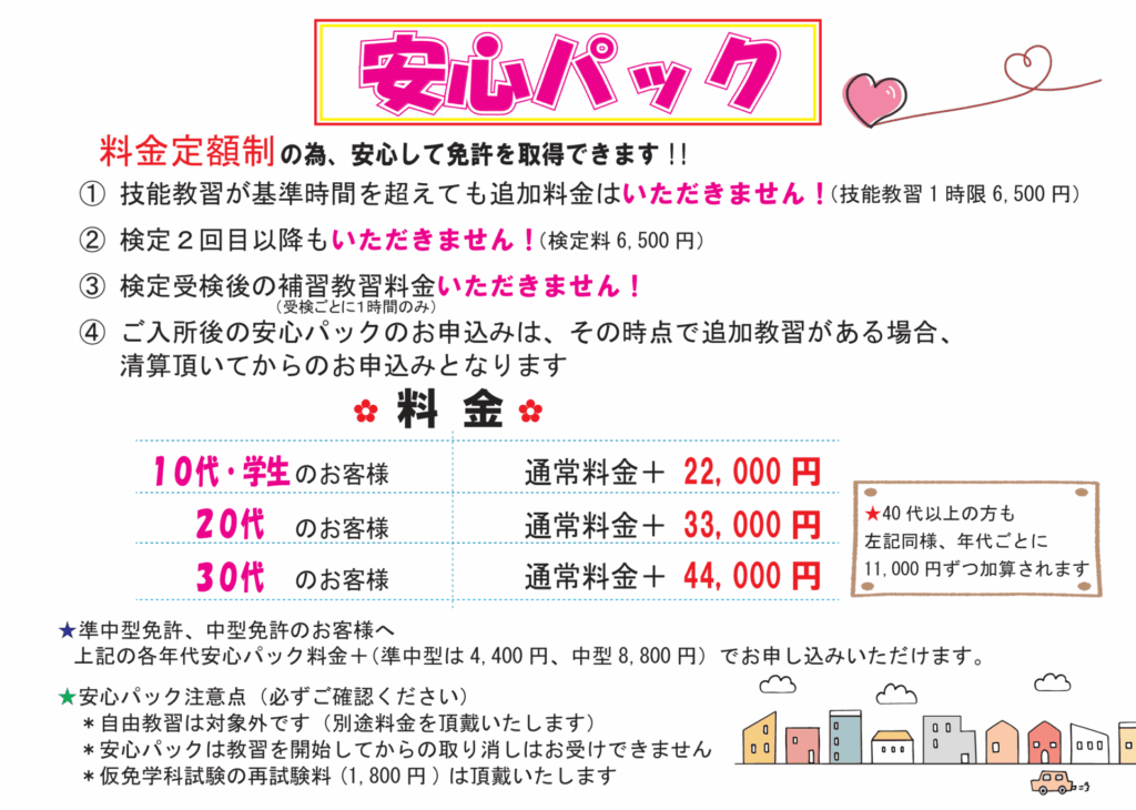 「安心パック」とは、追加の技能教習や検定不合格時の補習料金を心配せずに受けられるお得なオプション。高校生にとって大きな経済的メリットがあり、安心して教習に集中できる人気のプランです。この機会をぜひご活用ください。