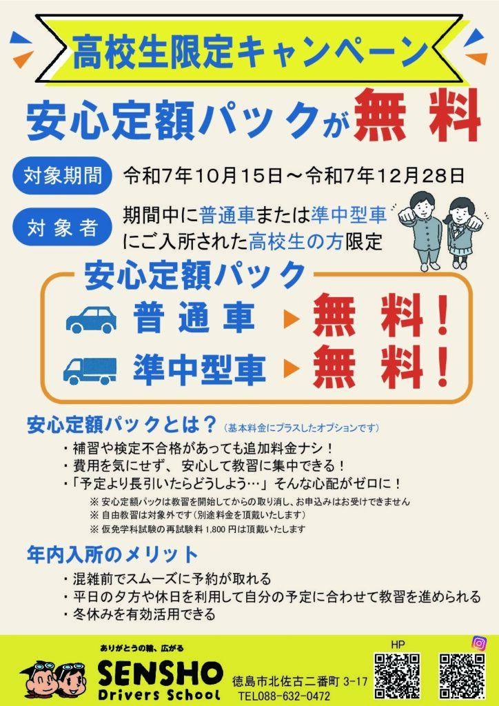 千松自動車教習所では、日頃のご愛顧に感謝し、この秋「高校生限定 安心パック22,000円無料キャンペーン」を実施いたします。